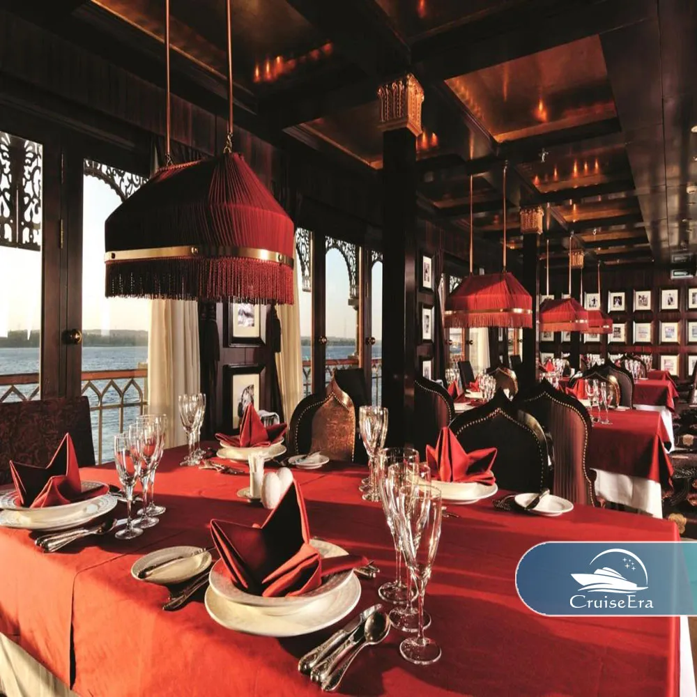 Dining on the Mövenpick SS Misr Nile Cruise is a sophisticated affair, featuring a Fine Dining restaurant that serves a blend of international gourmet cuisine and traditional flavors. As you sail on the Mövenpick SS Misr, every meal is an event set within the nostalgic charm of a authentic Steam-powered vessel. Whether you are relaxing in the lounge bar or enjoying the sun on the deck of the Misr Nile Cruise, the Mövenpick SS Misr Nile Cruise ensures a refined experience. The SS Misr Cabins provide the perfect retreat, blending the mechanical soul of a 1918 naval masterpiece with the luxury of the present.