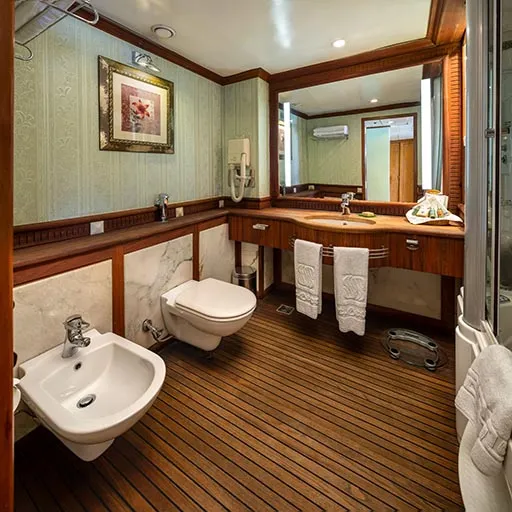 The vessel features a total of 47 deluxe cabins, 9 Presidential Suites, and one Royal Suite. All accommodations are equipped with the highest quality furnishings and upscale amenities, ensuring a relaxing and indulgent stay throughout the Sonesta St. George voyage.