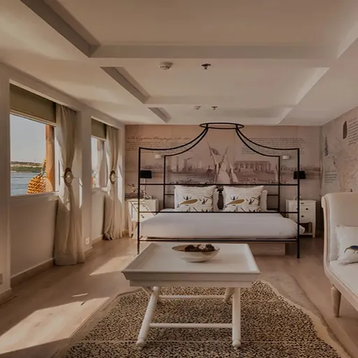 | Farouk Suite | Egypt’s Royal era, tranquil Upper Egypt oasis. | Private dining area, superb panoramic windows, luxurious bathroom with whirlpool tub. |