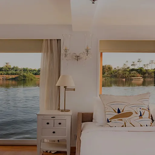 | Philae Cabin | Tranquility and romance. | King-size bed, elegant decor, walls featuring a floor-to-ceiling map of Egypt and the Nile. |